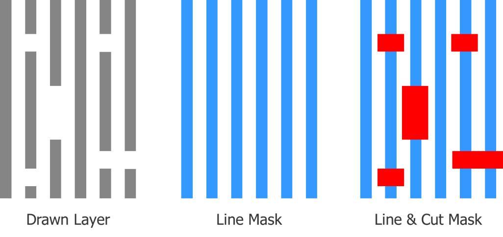 有趣的是20nm工藝節(jié)點的多晶硅(門)層也使用兩個光罩,但是分離的方式與其它 DP 層所需的 LELE 流程不同。它使用一個線條/切割流程。多晶硅層必須嚴格單向走線。這些線條全部使用第一個“線條”光罩定義。無論線條里哪兒有空隙(間隔),則使用第二個“切割”光罩來定義這些空隙。圖一是這個線條/切割雙光罩分離流程的示例。