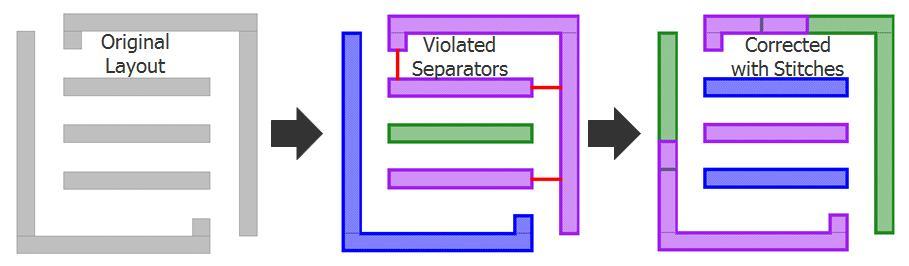 由于這個工藝類似于 20/16/14nm雙重曝光工藝,設(shè)計師可能會發(fā)現(xiàn)很多類似之處,這會使轉(zhuǎn)變到三重曝光工藝更容易。即使是使用縫合這樣的固定解決方案,對于這個工藝而言理論上也是可行的。圖4顯示了一個版圖示例,這個版圖在三個光罩中不能自然分解,但可以通過利用縫合成功分解。