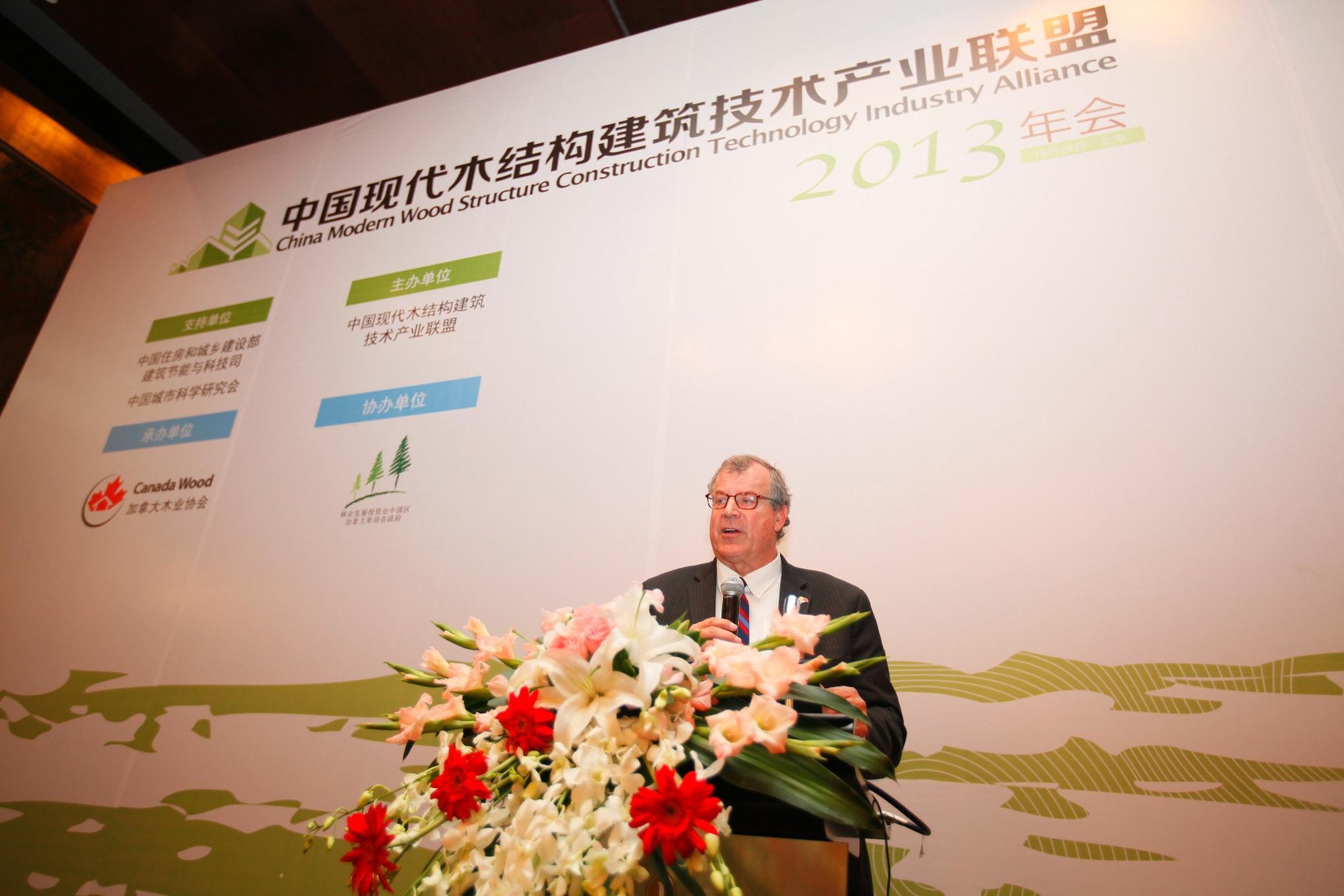 北京2013年10月25日電 /美通社/ -- 由住房城鄉建設部建筑節能與科技司、中國城市科學研究會和中國現代木結構建筑技術產業聯盟、加拿大木業協會、卑詩省林業廳中國辦事處共同主辦的“中國現代木結構建筑技術產業聯盟2013年會”于2013 年10月24日在北京北辰洲際酒店隆重召開。住房和城鄉建設部建筑節能與科技司副司長同時兼任中國現代木結構建筑技術產業聯盟理事長韓愛興,加拿大卑詩省林業廳廳長史蒂夫湯姆遜(Steve Thompson),加拿大自然資源部政策經濟與產業司司長格蘭梅森(Glenn Mason)以及中國綠色建筑委員會主任王有為出席大會并致辭。